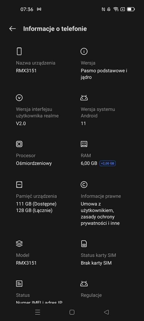 • System Androida 11 z nakładką realme UI 2.0. Będzie on objęty aktualizacją do Androida 12.