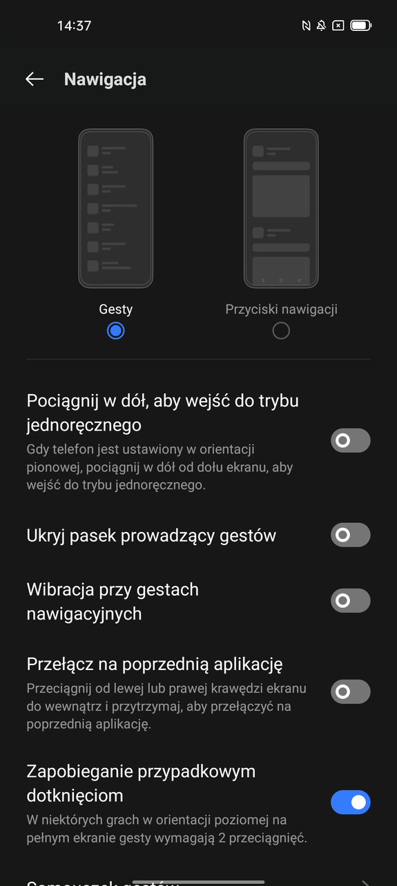 Ponadto smartfon nie posiadają żadnych przycisków (nikogo to już nie dziwi). Prawdę mówiąc nie warto już nawet o tym wspominać. Podobnie też jak już w wielu modelach, możemy włączyć obsługę gestami. Oprócz gestów możemy też włączyć standardową dolną belkę z przyciskami. Dodatkowo możemy włączyć inteligentny pasek boczny. Zatem każdy bez problemu znajdzie swoją ulubioną konfigurację nawigacji.
