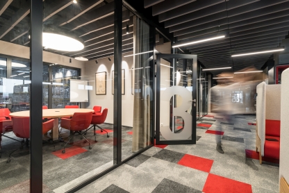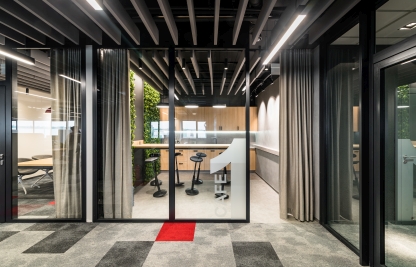 Jednym z najciekawszych rozwiązań zastosowanych w projekcie modernizacji biura firmy HAMA było wprowadzenie szklanych elementów. W celu stworzenia bardziej odizolowanych przestrzeni do rozmów czy pracy koncepcyjnej, projektant zdecydował się na montaż szklanych ścianek w grafitowych, aluminiowych ramach. Ich wykonaniem zajęła się firma AWILUX – producent okien i drzwi z Leszna.
