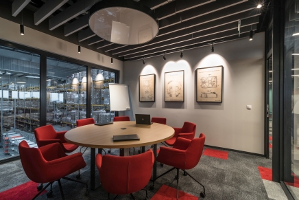 Ciekawym zabiegiem architektonicznym było także wstawienie podobnych przeszkleń w otworach wyburzonych pomiędzy biurami a halą magazynową. Miało to na celu jeszcze większe otwarcie i wzajemne przenikanie przestrzeni, a także usprawnienie pracy zespołów odpowiedzialnych za pakowanie produktów.