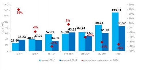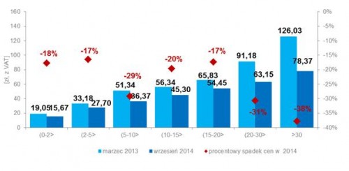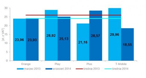 Średnie koszty ponoszone przez klientów pre-paid również spadły w porównaniu z rokiem 2013. W roku ubiegłym za tę usługę trzeba było zapłacić średnio 26 zł. Obecnie cena ta jest o 2 zł niższa i wynosi 24 zł.