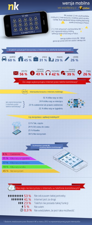Z badania Research.NK wynika, że użytkownicy portalu NK coraz chętniej korzystają z niego przez telefon komórkowy. 6% z nich robi to codziennie, 11% kilka razy w tygodniu, a 17% kilka razy w miesiącu. Grupa Użytkowników nk.pl korzystających również z mobilnej wersji serwisu stanowi zatem większość z wszystkich użytkowników, mimo wciąż licznej (45%) grupy tych, którzy wybierają głównie tradycyjne formy dostępu do portalu.