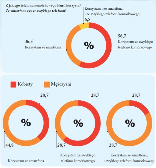 Smartfonów używa zdecydowanie więcej mężczyzn niż kobiet, ponad połowa z nich deklaruje używanie smartfona (52,6%), podobna liczba mężczyzn deklaruje używanie zwykłego telefonu. Kobiety zdecydowanie częściej używają zwykłych telefonów (aż 71,3%) niż smartfonów (31,1 %) i tylko 2,4% kobiet używa i jednego i drugiego. Wśród mężczyzn jest to co dziesiąty (11,5%).