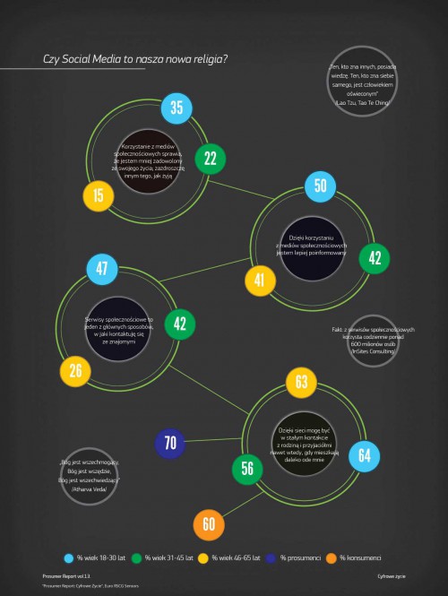 Badani (53% prosumentów i 45% konsumentów) czują się zmęczeni nadmiarem technologii, a ponad połowa narzeka na ogrom napływających zewsząd informacji oraz na ciągłe „zabieganie”, przez które brakuje im czasu na czerpnie radości z codziennego życia. Jednocześnie badani nie potrafią wyobrazić sobie, jak mogliby stawić czoło wyzwaniom dnia codziennego bez dostępu do tych nowoczesnych udogodnień, doceniając na przykład obecność w mediach społecznościowych – aż 75% prosumentów i 41% przeciętnych konsumentów uważa, że obecność w social media czyni ich lepiej poinformowanymi.