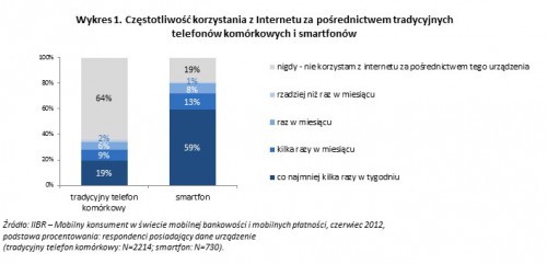 Mimo że w Polsce daleko nam jeszcze do tego wyniku, popularność urządzeń mobilnych, w tym przede wszystkim smartfonów, stale rośnie. Ma to wpływ nie tylko na zmianę sposobu użytkowania telefonii, ale przede wszystkim – na sposób korzystania z Internetu. Jak wynika z badania Interaktywnego Instytutu Badań Rynkowych, co piąty polski internauta korzysta obecnie z sieci za pośrednictwem „tradycyjnego telefonu komórkowego” lub smartfona. Widać też wyraźnie, iż użytkownicy smartfonów są znacznie bardziej skłonni korzystać z Internetu za pośrednictwem swojego telefonu niż ci, którzy posiadają „tradycyjną komórkę”.