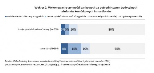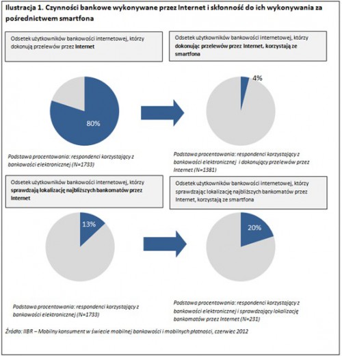 Raport IIBR „Mobilny konsument w świecie mobilnej bankowości i mobilnych płatności” pokazuje jednak, iż banki mają jeszcze dużo do zrobienia, aby zachęcić internautów do korzystania ze swoich usług za pośrednictwem urządzeń mobilnych. Co prawda, internauci są skłonni korzystać ze smartfonów w celu znalezienia najbliższego bankomatu czy placówki banku lub sprawdzenia salda swojego konta, jednak wykonywanie za pośrednictwem smartfona czynności związanych z obsługą konta, jak na przykład: dokonywanie przelewów internetowych, płacenie rachunków czy dokonywanie operacji na karcie kredytowej należy do rzadkości.