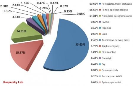 Dane otrzymane z chmury Kaspersky Security Network pokazują, że ostrzeżenia generowane przez kontrolę rodzicielską najczęściej dotyczą kategorii „Pornografia, treści erotyczne”, „Portale społecznościowe” oraz „Nielegalne oprogramowanie”. Pod tym względem te trzy kategorie zdecydowanie wyprzedzają pozostałe. Każdego miesiąca ma miejsce 60 milionów prób uzyskania dostępu do stron z zawartością pornograficzną, niemal czterokrotnie więcej niż w przypadku kategorii, która uplasowała się na drugim miejscu. Ostrzeżenia wygenerowane przez kontrolę rodzicielską firmy Kaspersky Lab pokazują, że dzieci celowo lub niechcąco odwiedzają strony zawierające niepożądane treści.