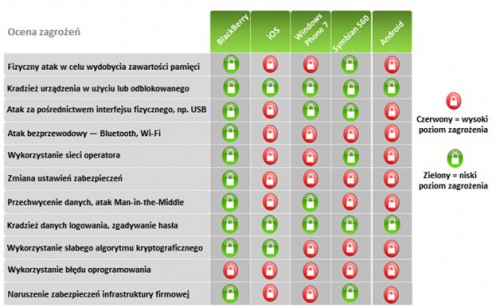 Badacze ze Strategy Analytics ocenili także bezpieczeństwo systemów operacyjnych BlackBerry® 7, Apple iOS® 5, Symbian S60 i Windows Phone 7 (WP7) na podstawie jedenastu kryteriów. Najbezpieczniejsze okazało się rozwiązanie BlackBerry, z którym wiąże się niski poziom zagrożeń w 10 z 11 kategorii. Z raportu wynika również, że całościowa architektura rozwiązania BlackBerry, łącznie z szyfrowaniem danych przechowywanych i przesyłanych, zmniejsza maksymalny poziom zagrożeń i zapewnia niezbędne wsparcie polityki bezpieczeństwa IT.
