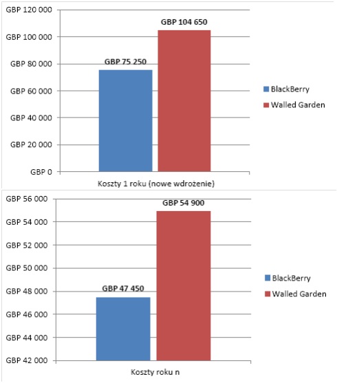 W zamówionym przez Research In Motion badaniu uwzględniono typowe dla branży najlepsze praktyki na przykładzie brytyjskiego sektora publicznego. Zbadano całe rozwiązanie mobilne — łącznie z funkcjami zarządzania urządzeniami oraz samymi urządzeniami — w środowisku obejmującym 100 użytkowników smartfonów i działającym na poziomie IL2, co stanowi minimalny standard bezpieczeństwa dla wszystkich urzędów brytyjskich, w tym placówek edukacyjnych, medycznych i samorządowych. W ramach badania porównano dwa podejścia do mobilności: BlackBerry Enterprise Solution oraz model zamknięty (tzw. Walled Garden), w którym wszystkie urządzenia innej marki niż BlackBerry mają dostęp przez VPN do bezpiecznej, ograniczonej strefy w sieci i są zarządzane przy użyciu oprogramowania do zarządzania urządzeniami mobilnymi innego producenta. Po roku badań okazało się, że koszt bezpiecznego zarządzania urządzeniami innymi niż BlackBerry w modelu zamkniętym jest większy o 39% od zarządzania urządzeniami BlackBerry w środowisku serwera BlackBerry Enterprise Server (BES). Z badań wynika też, że model zamknięty będzie nadal kosztować więcej niż rozwiązanie BlackBerry także w kolejnych latach.