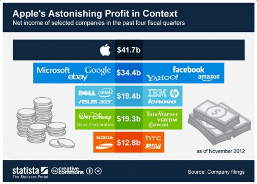 Czysty zysk w ciągu ostatnich czterech kwartałów wyniósł ponad trzy razy więcej, niż ten zarobiony przez największych konkurentów razem wziętych (Nokia, Samsung, HTC – 12 miliardów dolarów).
