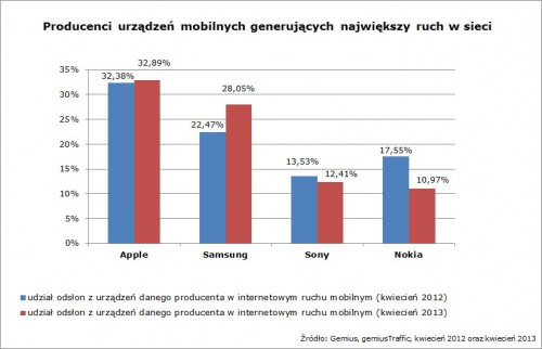 Choć wśród producentów urządzeń mobilnych generujących największy ruch w polskiej sieci pierwsze miejsce nadal zajmuje Apple (tablety i smartfony tego producenta odpowiadają za niemal 33 proc. wszystkich odsłon pochodzących z urządzeń przenośnych), to największy procentowy wzrost zanotował Samsung. Udział urządzeń tego producenta w ogólnej liczbie odsłon mobilnych wzrósł w porównaniu z ubiegłym rokiem o 25 proc. (wynosi obecnie 28 proc.), podczas gdy w przypadku Apple odnotowano wzrost na poziomie 2 proc. W analizowanym okresie zmniejszyła się natomiast sieciowa aktywność takich producentów jak: Nokia (spadek o 37 proc. do 11 proc.) oraz Sony (spadek o 8 proc. do 12 proc.).
