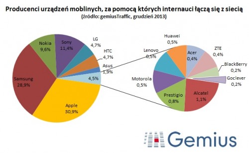 Jak pokazuje grudniowy pomiar ruchu na stronach www, prowadzony przez firmę badawczą Gemius, różnica w udziale w ruchu internetowym między Apple i Samsungiem wynosi 2 punkty procentowe. Łącznie z urządzeń tych dwóch czołowych producentów urządzeń mobilnych pochodzi 60 proc. odsłon w polskiej sieci (31 proc. Apple i 29 proc. Samsung). W porównaniu do grudnia 2012 roku pozycja obu zmieniła się o jedną dziesiątą – tyle zyskał Samsung (z 27 proc. do 29 proc.), a Apple stracił (spadek z 35 proc. do 31 proc.).