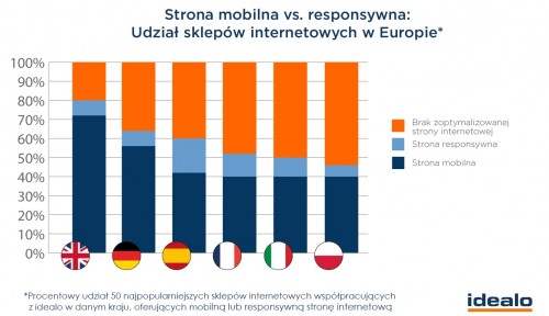 W europejskiej średniej większość sklepów posiada strony mobilne. Tylko nieznaczny odsetek wszystkich zbadanych przez idealo sprzedawców decyduje się na stronę responsywną. Powodem takiego stanu rzeczy może być pracochłonny proces deweloperski. Szybką i efektowną prezencję na rynku usług mobilnych zapewnia strona mobilna, zaś strona responsywna jest rozwiązaniem bardziej uniwersalnym i długoterminowym. Dla konsumentów natomiast rodzaj strony internetowej nie ma ostatecznie dużego znaczenia, póki funkcjonalność i pozytywne doświadczenia z zakupów nie różnią się znacznie od znanych z wersji typu desktop.