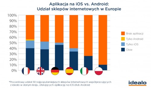 Aplikację będącą uzupełnieniem strony internetowej sklepu najczęściej, bo w 56% przypadków, znaleźć można w sklepach internetowych we Francji. Na kolejnych miejscach plasują się Wielka Brytania (52%) oraz Niemcy (50%). Zestawienie sklepów oferujących aplikację na iOS i Android ponownie zamykają Włochy z 25% oraz Polska, w której oprogramowanie zakupowe dla urządzeń przenośnych oferuje jedynie 10% sklepów.