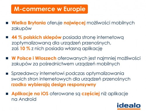 Badania idealo wyraźnie wskazują, że polskie i włoskie sklepy internetowe wciąż są na początku swojej drogi do dalszego rozwoju m-commerce, jaką dziś mają już przebytą rynki takie jak Wielka Brytania lub Niemcy. Wśród niemieckich sprzedawców niemalże standardem jest bowiem posiadanie przez nich zarówno stron internetowych zoptymalizowanych dla urządzeń przenośnych, jak również aplikacji zakupowych. W przypadku polskich sklepów tak szeroki wachlarz możliwości udostępniany jest klientom przez zaledwie 8% sprzedawców. Według raportu „M-commerce w praktyce 2014” główną przeszkodą we wdrażaniu rozwiązań mobilnych przez polskich sprzedawców są wysokie koszty i czasochłonność tego rodzaju przedsięwzięcia. Mimo to z biegiem czasu coraz więcej z nich planuje tego typu inwestycję w ciągu najbliższych miesięcy. Są więc powody, by sądzić, że sytuacja na polskim rynku m-commerce ma szansę niebawem się zmienić.