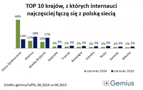 W ujęciu rocznym największy, bo ponad trzykrotny, wzrost ruchu na polskich stronach WWW odnotowały Stany Zjednoczone (14 proc. w czerwcu 2013 roku). Natomiast w Niemczech i Wielkiej Brytanii ruch ten zmalał odpowiednio o jedną trzecią (18 proc.) i ponad połowę (17 proc.).