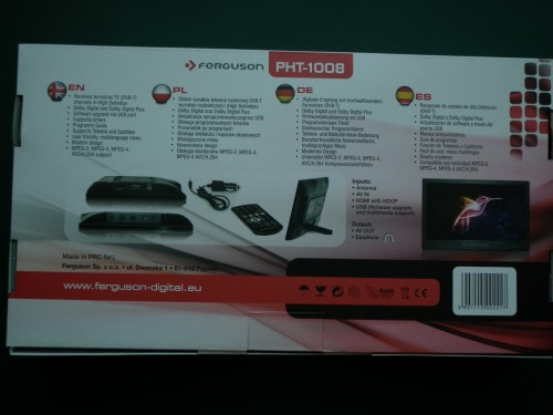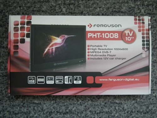 Dzięki wbudowanemu tunerowi DVB-T, posiadacz tego urządzenia będzie na bieżąco z informacjami ze świata oraz ulubionymi programami telewizji cyfrowej. Urządzenie może służyć także jako odtwarzacz multimedialny z opcją PVR Ready, która daje możliwość nagrywania oglądanych programów na dysk zewnętrzny lub pen drive. Dodatkowe wyposażenie w port USB sprawia, że gdy w telewizji nie ma ciekawych programów, użytkownik może odtwarzać z zewnętrznych nośników filmy lub zdjęcia w wielu popularnych formatach. A to wszystko na kolorowym, 10.1 calowym ekranie LCD o rozdzielczości HD. Zaopatrzenie telewizora w dwa zasilacze pozwala na swobodne użytkowanie go w samochodzie oraz w domu, dodatkową zaletą telewizora jest wbudowany akumulator pozwalający na korzystanie z jego dobrodziejstw bez zewnętrznego źródła zasilania. Ferguson PHT-1008 jest dostępny w dobrych sklepach z elektroniką użytkową w sugerowanej cenie: 399 PLN. Miałem przyjemność go przez jakiś czas używać, postanowiłem więc podzielić się z Wami wrażeniami z testów.