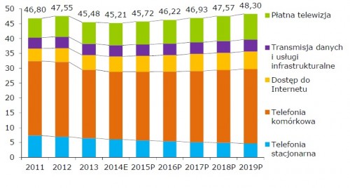 W 2014 r. wartość rynku telekomunikacyjnego spadnie drugi rok z rzędu i osiągnie rekordowo niską wartość: 45,2 mld zł – Choć spełniły się pesymistyczne prognozy, to jednak tym razem spadek nie będzie tak wyraźny jak w roku ubiegłym – zaledwie 0,6%. Według operatorów najgorsza sytuacja była w pierwszym kwartale b.r., ale rynek zaczyna odrabiać straty. Żeby jednak przerodziło się to w trwały trend wzrostowy, potrzebne są całkowicie nowe rozwiązania i usługi. Audytel przewiduje, że w latach 2014-2019 wdrożenie nowych usług oraz zwiększeniu penetracji dostępu szerokopasmowego pozwoli na utrzymanie wzrostu przychodów na poziomie 1,3% każdego roku.