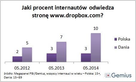 Analiza danych z maja 2014 roku pokazuje, że w Polsce w ciągu dwóch lat zainteresowanie stroną Dropboksa wzrosło niemal dwukrotnie. W maju 2014 roku odwiedziło ją prawie 3 proc. polskich internautów (620 tys. osób). Dwa lata temu w analogicznym okresie skorzystało z niej niecałe 2 proc. użytkowników sieci.
