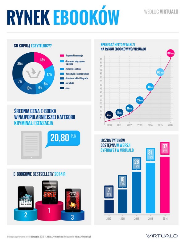 Rok 2014 zdecydowanie wzmocnił pozycję e-booków na rynku książki w Polsce. Wielkość sprzedaży książek elektronicznych w ciągu minionych 12 miesięcy firma Virtualo oszacowała na 40 mln zł netto. W ofercie największego dystrybutora e-książek dostępnych było ponad 37 tys. tytułów. Dobra dynamika wzrostu, rosnąca dostępność tytułów w wersji elektronicznej oraz efektywna współpraca z wydawnictwami i partnerami pozwoliła firmie zakończyć z sukcesem kolejny rok na rynku publikacji elektronicznych.