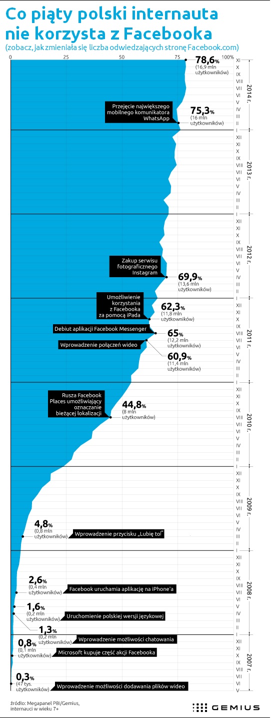 Facebook powstał 4 lutego 2004 roku. Z okazji jedenastych urodzin tego serwisu firma Gemius sprawdziła, jak na przestrzeni lat rosła jego popularność wśród polskich internautów. Analiza objęła dane z okresu maj 2007[1]–listopad 2014 roku.