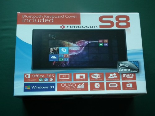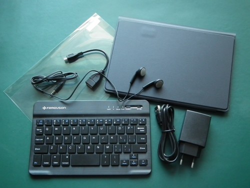 Estetycznie wykonane pudełko z Ferguson S8, od razu prezentuje nam za pomocą nadrukowanej informacji, z czym mamy do czynienia. W zestawie sprzedażowym, poza samy tabletem znajdziemy ładowarkę sieciową, kabel USB do komputera, kabel USB do podłączenia zewnętrznych akcesoriów z USB (np. modem 3G, pamięć USB, adapter Ethernet – akcesoria sprzedawane osobno) i słuchawki. Producent dorzuca klawiaturę Bluetooth, pełniąca jednocześnie funkcję podstawki pod tablet i etui, oraz folię zabezpieczającą ekran. Biorąc pod uwagę cenę 560 pln, to na tym tle Ferguson S8 wypada całkiem dobrze.
