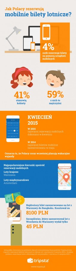 Już niemal 60 proc. Polaków jest w posiadaniu smartfona, a co piąty z nas jest użytkownikiem tabletu – wynika z raportu POLSKA.JEST.MOBI przygotowanego przez jestem.mobi we współpracy z TNS Polska. – Nasi klienci również korzystają ze smartfonów i tabletów przy zakupie biletów. Spośród osób kupujących bilety lotnicze na lato do tej pory 4,3 proc. dokonało rezerwacji właśnie poprzez urządzenie mobilne – mówi Phillipp Brinkmann, CEO internetowego biura podróży Tripsta. – Mężczyźni zdecydowanie częściej kupują bilety za pomocą smartfona lub tabletu. Stanowią oni aż 59 proc. wszystkich pasażerów, którzy zarezerwowali lot na miesiące letnie w serwisie Tripsta.pl za ich pomocą – dodaje.