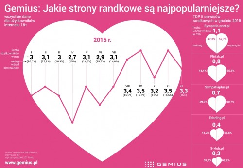Najpopularniejszym serwisem randkowym w Polsce jest Sympatia.onet.pl. W grudniu 2015 roku odwiedziło tę stronę 1,1 mln internautów (5,4 proc. wszystkich użytkowników sieci). Na drugim miejscu znajduje się Flirtak.pl – ten serwis odwiedziło 0,8 mln internautów (3,7 proc.). Trzecim serwisem pod względem popularności jest Sympatiaplus.pl. Odwiedziło ją w grudniu 2015 roku 0,7 mln użytkowników sieci (3,4 proc.).