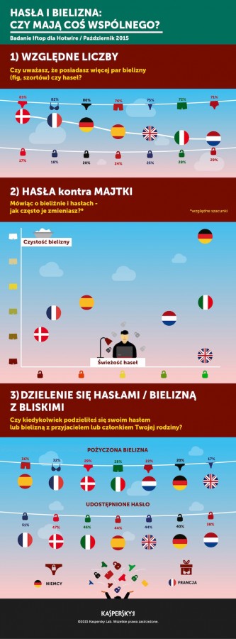 Tę niefrasobliwość w stosunku do haseł wielu użytkowników tłumaczy tym, że nie przechowuje żadnych poufnych informacji na swoich komputerach. Takie przekonanie żywi 27% respondentów, nie zdając sobie sprawy, że hasła i loginy są ulubionym celem cyberprzestępców. Ponadto inne przeprowadzone niedawno badanie firmy Kaspersky Lab pokazało, że 73% użytkowników wolałoby ujawnić swoje hasła, niż chodzić bez bielizny.