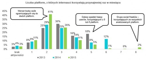 Pomimo różnorodności serwisów, w których możemy uczestniczyć, coraz więcej internautów ogranicza się do 1-2 platform. W 2014 roku internautów korzystających z dwóch serwisów było 29%, w 2015 jest to już 41%. Jednocześnie spada liczba heavy userów – w 2014 roku z 6 serwisów korzystał co 10 internauta (12%), a w 2015 roku już co 100 (1%). Największą popularnością cieszą się Facebook i Youtube, z których korzysta średnio 94% internautów, ale to Facebook ma największą intensywność korzystania – 88% internautów korzysta z niego przynajmniej raz w tygodniu.