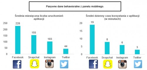 Mniej popularne platformy także nieźle dają sobie radę, gdyż pomimo mniejszej liczby użytkowników często cechuje je duża intensywność odwiedzin. Ze Snapchata, minimum kilka razy w tygodniu, korzysta ponad połowa użytkowników (53%), co jest wynikiem lepszym od np.: Twittera, którego z taką częstotliwością odwiedza co czwarty użytkownik (27%). Na smartphonach najczęściej i najdłużej korzystamy oczywiście z Facebooka. Snapchat natomiast pod względem średniej liczby uruchomień aplikacji w miesiącu oraz średniego czasu korzystania z aplikacji wyprzedził już większego od siebie Instagrama.