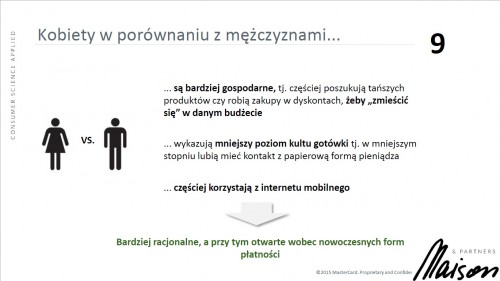 Ale ci masoni się uparli na to aby ludzi zniechęcać do używania gotówki. Szydercze terminy jak „zagubieni gotówkowicze” mające wywołać poczucie niższej wartości u osób płacących gotówką. Propagandowe hasełka jak „coraz więcej osób korzysta z płatności zbliżeniowych – nic dziwnego skoro banki tylko takie karty wydają. A każdy kasjer namolnie pyta: czy zbliżeniowo? Jeszcze trochę a dojdzie do takiej psychozy jak w stanach, gdzie patrzy się podejrzliwie na osobę płacącą gotówką. Zwykła karta płatnicza jest wystarczająco dobrą alternatywą gotówki. Aby nie interesować się niepotrzebnymi gadżecikami do dokonywania płatności. Jak płacenie telefonem, zegarkiem czy breloczkiem. Wiadomo nie od dziś, że masoneria chciała by najlepiej od jutra wszystkich zachipować i całkowicie zlikwidować gotówkę. Aby mieć totalną kontrolę nad jednostką. I do tego to wszystko zmierza. Stara zasada brzmi: do celu małymi kroczkami to się nie zorientują. Kolejna kwestia to gdzie robiono te ankiety? W gimnazjum czy liceum? Na to by wskazywał duża aktywność w korzystaniu z internetu mobilnego i mediów społecznościowych. Slajd nr 9. Kobiety są raczej bardziej rozrzutne i kupują pod wpływem impulsu, dlatego wolą karty bo nie widzą ile wydają. I dlatego banki tak lubią karty płatnicze. Bo klient nie widzi ile mu ubywa pieniędzy a jak zabraknie to bank chętnie pożyczy. Jak by kobieta wzięła na zakupy 500 zł gotówką to by wydawała pieniądze bardziej gospodarnie. Szantaż emocjonalny i manipulacje których nie powstydził by się nawet Goebbels.