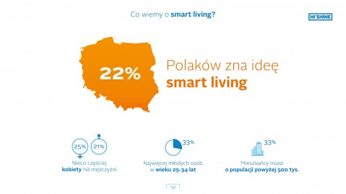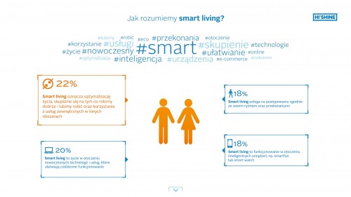 Pojęcie smart living jest znane 22 proc. Polaków. Częściej są to kobiety oraz osoby w wieku od 25 do 34 lat, mieszkańcy dużych miast. Smart living rozumiany jest przez badanych jako optymalizacja życia, skupianie się na tym, co robimy dobrze, korzystanie z usług zewnętrznych ułatwiających codzienne obowiązki. Polacy, zapytani o znaczenie smart living, wskazali także na życie w otoczeniu nowoczesnych technologii i w zgodzie z własnym rytmem.