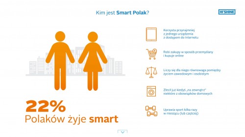 Autorzy raportu „Smart Living. Czy Polacy prowadzą mądre i sprytne życie? Portret Smart Polaka” przyjęli definicję Smart Polaka. – To osoba, która w minimalnym stopniu realizuje ideę smart living w najważniejszych obszarach życia. Oznacza to, że korzysta z przynajmniej jednego urządzenia z dostępem do internetu, robi zakupy w sposób przemyślany i kupuje online, zleciła już kiedyś „na zewnątrz” przynajmniej jeden z obowiązków domowych oraz istotna jest dla niej równowaga pomiędzy życiem zawodowym i osobistym – wymienia Rafał Staszkiewicz, współautor raportu, CEO Pralniomatów Hi’Shine. Przyjmując taką definicję, w Polsce 22 proc. osób żyje smart.