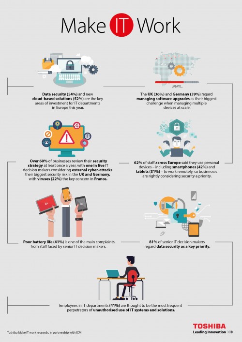 Z badania zleconego przez Toshiba Europe GmbH wynika, że w tym roku europejskie działy IT najwięcej zainwestują w zabezpieczanie danych (54%) i nowe rozwiązania chmurowe (52%). Firma przebadała 400 osób odpowiedzialnych za IT w średnich i dużych firmach we Francji, Niemczech i Wielkiej Brytanii.