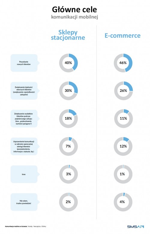 Głównym celem prowadzonej komunikacji mobilnej, wskazywanym przez respondentów w wyniku pogłębionych wywiadów na zlecenie SMSAPI.pl, było pozyskiwanie nowych klientów. Na akwizycję wskazywało aż 46% firm e-commerce oraz 40% firm z obszaru handlu tradycyjnego. Na drugim miejscu znalazło się zwiększenie lojalności obecnych klientów, w efekcie zwiększające częstotliwość zakupów. Warto jednak zauważyć zróżnicowanie w zależności od wielkości przedsiębiorstwa – im większa firma, tym bardziej na znaczeniu zyskiwały działania retencyjne w przeciwieństwie do akwizycyjnych. Na kolejnych miejscach pojawiło się „podwyższanie wartości paragonu”, czyli zwiększenie wydatków klientów podczas pojedynczego zakupu oraz usprawnienie komunikacji w zakresie operacyjnej obsługi klientów, w skład których wchodzą powiadomienia, informacje o statusie zamówienia itd.