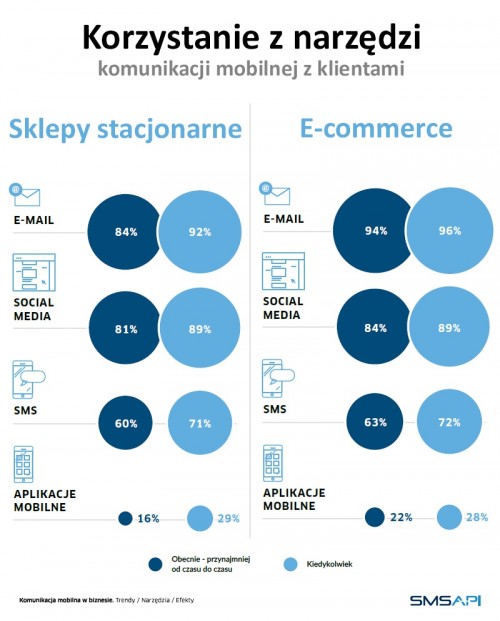 Obecnie najczęściej wykorzystywanym narzędziem komunikacji mobilnej w e-commerce jest e-mail. Wskazało na niego 94% respondentów. Z social mediów korzysta obecnie 84% badanych, z SMS-ów – 63%, a z aplikacji mobilnych – 22%. W sklepach tradycyjnych trend jest podobny. Najczęściej wykorzystywany jest e-mail (84%) przed social mediami (81%), SMS-ami (60%) i aplikacjami mobilnymi (16%).