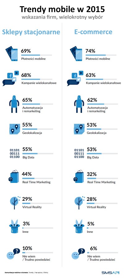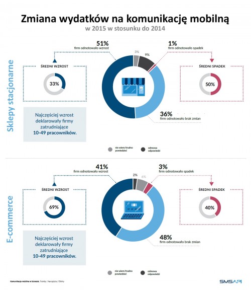 Wśród działających w Polsce firm wzrastają wydatki na komunikację mobilną. Aż 41% przedsiębiorstw e-commerce oraz 51% firm z obszaru handlu tradycyjnego zadeklarowało, że ich wydatki na ten cel w 2015 roku wzrosły (w porównaniu do roku 2014) – wynika z raportu przeprowadzonego przez Ipsos Polska dla SMSAPI.pl. Średni wzrost wydatków w handlu internetowym wyniósł 69%, a w tradycyjnym – 33%.