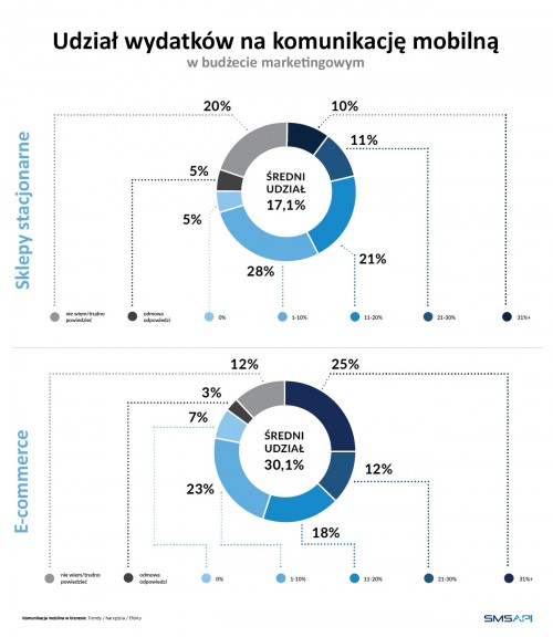 Branża e-commerce przeznacza na komunikację mobilną aż 30% swojego budżetu marketingowego. W przypadku firm zajmujących się sprzedażą tradycyjną jest to około 17%. Średnio jedna czwarta firm z obydwu segmentów wskazała przedział 1-10%, a jedna piąta – od 11 do 20%.