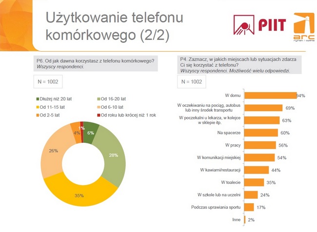 Z badania wynika, telefon komórkowy towarzyszy Polakom przy większości sytuacji codziennego życia. Używamy „komórek” niemal przy każdej możliwej sytuacji – często do „zabicia czasu” (w środkach komunikacji, różnego rodzaju poczekalniach czy toalecie), ale też do umilania czasu (rozrywka) lub do pracy.