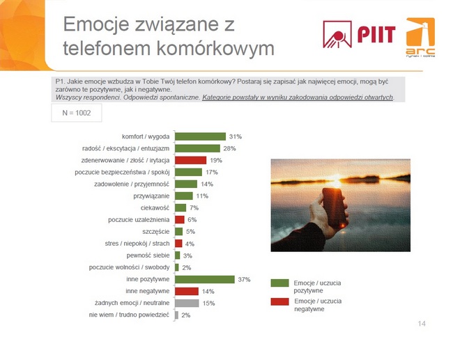 że 80% badanych posiada smartfony, które stały się obecnie wielofunkcyjnymi urządzeniami multimedialnymi nierzadko z parametrami technicznymi dobrego komputera. Prawie wszyscy użytkownicy smartfonów korzystają z aplikacji mobilnych, z czego nieco ponad połowa codziennie lub prawie codziennie. Biorąc pod uwagę fakt, iż tradycyjne telefony stopniowo znikają z rynku (producenci wstrzymują produkcję większości tradycyjnych modeli oraz ich rozwój technologiczny), można spodziewać się dalszego wzrostu penetracji smartfonów i, co za tym idzie, jeszcze większej popularyzacji aplikacji mobilnych. - Telefon budzi w nas wiele emocji, z których przeważają emocje pozytywne. Co trzeci badany kojarzy telefon z komfortem, wygodą. Do najczęściej wskazywanych emocji pozytywnych należą również: radość, ekscytacja, entuzjazm, czy też poczucie bezpieczeństwa, zadowolenie. Emocje negatywne mają mniejszy udział, a wśród nich respondenci najczęściej wskazywali zdenerwowanie, złość, irytację (19% wskazań). Mamy zatem z telefonem relację jak z dobrym przyjacielem – zbudza w nas pozytywne emocje i jesteśmy szczęśliwi, że go mamy, czasami natomiast zdarza mu się nas zirytować lub zezłościć.