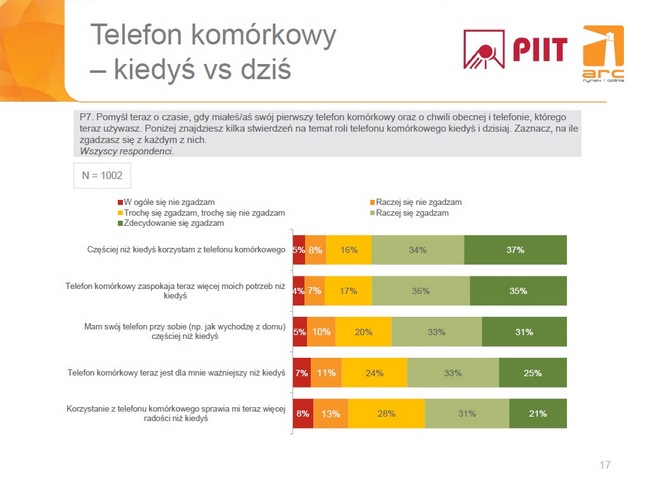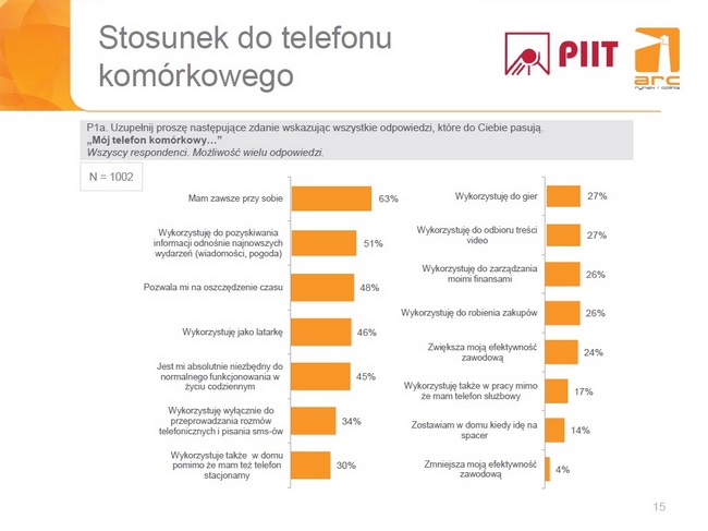 - Uzyskane w badaniu wyniki pozwalają stwierdzić, że telefon komórkowy jest nieodłącznym elementem życia Polaków, w zasadzie niezależnie od grupy demograficznej i ten trend będzie się tylko umacniał w przyszłości. Można spodziewać się zwłaszcza dalszej popularyzacji użycia telefonów w takich obszarach jak geolokalizacja, zarządzanie finansami, dostęp do Internetu czy robienie zdjęć/materiałów video.
