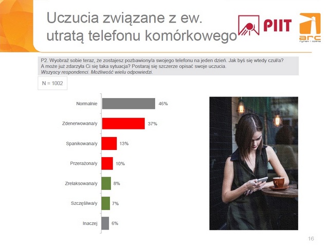 praktycznie zawsze ma telefon przy sobie, blisko połowa respondentów twierdzi, że jest on absolutnie niezbędny w życiu codziennym. Wynika to z szeregu korzyści, jakie telefony zapewniają ich użytkownikom, m in. pozwalają na zaoszczędzenie czasu poprzez substytuowanie różnych innych urządzeń. Dzięki telefonom komórkowym nasze życie stało się zatem łatwiejsze i bardziej komfortowe. Jakkolwiek posiadanie telefonu jest w dzisiejszych czasach raczej koniecznością, to jednak z naszego badania można wywnioskować, że Polacy lubią swoje telefony. - Potwierdzeniem faktu silnego związania badanych z telefonem są również wyniki pytania, w którym badani zostali zapytani, jak by się czuli w sytuacji pozbawienia dostępu do telefonu przez jeden dzień. Mniej niż połowa z nich czułaby się co prawda w miarę normalnie, lecz wśród innych emocji dominują te negatywne (zdenerwowanie, panika, przerażenie). Wynika to z szerokiego spektrum potrzeb zaspokajanych obecnie przez telefon. Pozbawiając kogoś tego urządzenia, odbieramy mu