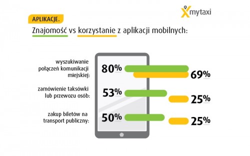 Najpopularniejsze wśród Polaków są aplikacje pozwalające na wyszukiwanie połączeń komunikacji miejskiej. Znajomość tego typu aplikacji deklaruje aż 80% badanych, z czego 69% z nich korzysta. Aplikacje do zamawiania taksówek lub przewozu osób zna więcej niż połowa badanych (53%), a co czwarty z nich korzysta. Na nieco niższym poziomie znajomości znajdują się aplikacje związane z zakupem biletów na transport publiczny – równo połowa je zna, a ¼ z nich korzysta.