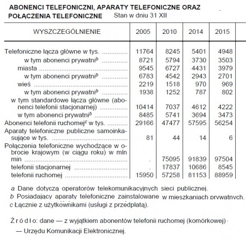 Telefon komórkowy w Polsce ma 95,2 proc. gospodarstw domowych, w tym smartfon 45,4 proc. W ciągu roku wykonano 8545 mln min połączeń telefonicznych wychodzących w obrocie krajowym, w telefonii stacjonarnej i 88959 mln min w telefonii ruchomej – podał Główny Urząd Statystyczny w siedemdziesiątym szóstym wydaniu Rocznika Statystycznego Rzeczypospolitej Polskiej.