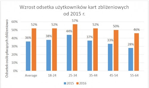 W Europie wydano dotąd 165 mln kart zbliżeniowych, z których można korzystać w 3,4 mln terminali płatniczych przystosowanych do akceptacji płatności w technologii NFC. Jak wskazują wyniki niedawnych badań zleconych przez Visa (Digital Payments Study 2016), odsetek użytkowników kart zbliżeniowych wzrósł z 36% w 2015 r. do 52% w 2016 r. Tendencja ta nie ogranicza się jednak do osób młodych, obeznanych z nowymi technologiami, lecz występuje we wszystkich grupach wiekowych – przy czym największy wzrost odsetka użytkowników kart zbliżeniowych odnotowano w grupie 55-64 lat.