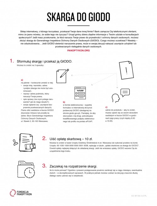 Jak wyjaśnia Fundacja Panoptykon w przygotowanej z okazji Dnia Ochrony Danych Osobowych infografice, każdy, kto uważa, że jego prawa do ochrony danych osobowych zostały naruszone, może złożyć skargę do Generalnego Inspektora Ochrony Danych Osobowych. GIODO może zażądać usunięcia uchybień lub przetwarzanych nielegalnie danych osobowych. W przypadku najpoważniejszych naruszeń może też skierować zawiadomienie o popełnieniu przestępstwa do organów ścigania.