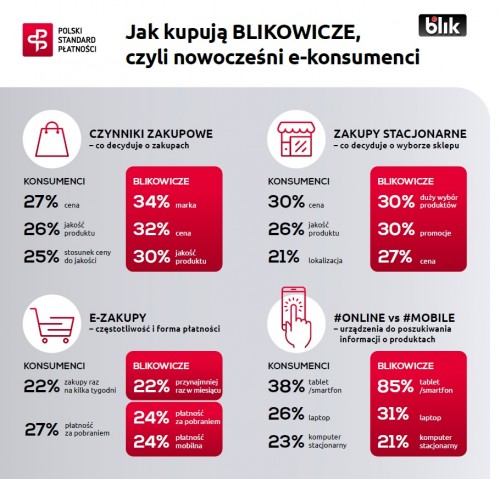 Użytkownicy BLIKA korzystają z technologii mobilnych nie tylko w płatnościach. Aż 85 proc. z nich korzysta ze smartfona i tabletu, gdy chce znaleźć informację o produktach. Wśród polskich konsumentów jest to ponad połowa mniej (38 proc.) Kupujący nadal wolą laptopy (26 proc.) i komputery stacjonarne (23 proc.).