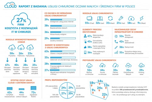 Użytkownicy technologii chmurowych deklarują, że odsetek usług IT działających w oparciu o rozwiązania lokalne wynosi w ich organizacjach 69 proc., natomiast pozostała część (31 proc.) wykonywana jest w oparciu o chmurę. Wśród ankietowanych przedsiębiorstw z Polski najpowszechniejszą usługą w chmurze jest przechowywanie danych (Storage as a Service, STaaS), której wykorzystanie deklaruje 55 proc. badanych. Mniej popularne są oprogramowanie jako usługa (Software as a Service, SaaS) i backup w chmurze (Backup as a Service, BaaS), których używa odpowiednio 32 proc. i 31 proc ankietowanych. Z kolei z platform informatycznych w modelu usługowym (Platform as a Service, PaaS) oraz z infrastruktury informatycznej jako usługi jako (Infrastucture as a Service, IaaS) korzysta kolejno 21 proc i 18 proc. badanych.