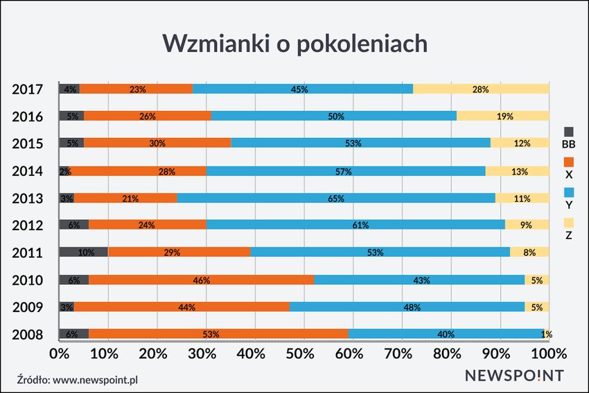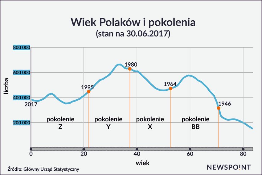 Według Głównego Urzędu Statystycznego liczba mieszkańców w Polsce na dzień 30 czerwca 2017 roku wynosiła 38,422 milionów kobiet i mężczyzn. Najwięcej osób mieści się między 30 a 40 rokiem życia, a najmniej jest tych po siedemdziesiątce. Analizując dane pod kątem liczności poszczególnych pokoleń (BB, X, Y, Z) otrzymujemy najwięcej Z-tów: 8,983 miliona i 23,4% ludności Polski. Drugie co do wielkości pokolenie to Y-ki z wynikiem 22,8%. O 57 tysięcy mniej mamy baby boomersów, którzy stanowią 22,7% naszej populacji. Pokolenie X stanowi tylko 20,5% naszej populacji. Najwięcej mamy w społeczeństwie przedstawicieli pokolenia Z i Y. Pokoleń zżytych z internetem. Pokoleń najbardziej aktywnych na platformach social mediowych.